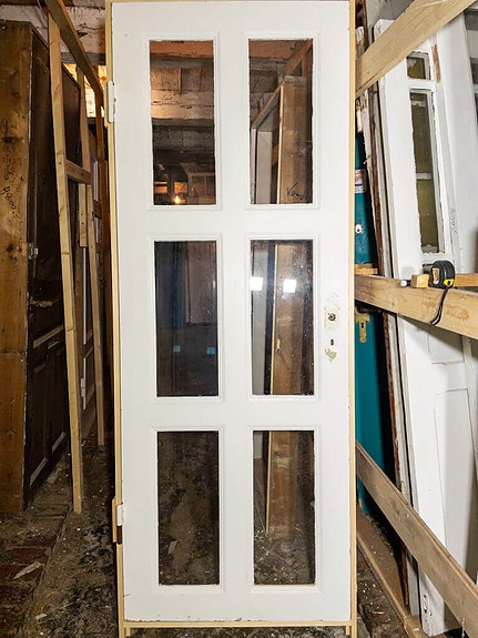 Bred, original funkisdør fra 1942. Monteret med greb og nøgleskilte i grå bakelit. Inkl. original karm og bundstykke. Fint og sundt træværk. Maling afskallet nogle få steder. Almindelige brugsspor.