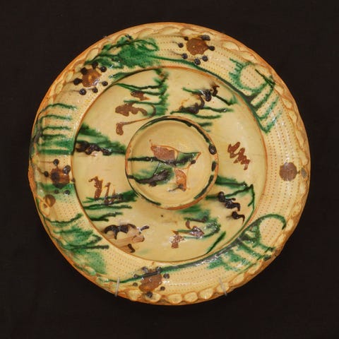 Stort skrivetøj, lertøj. Prydet med liggende hund