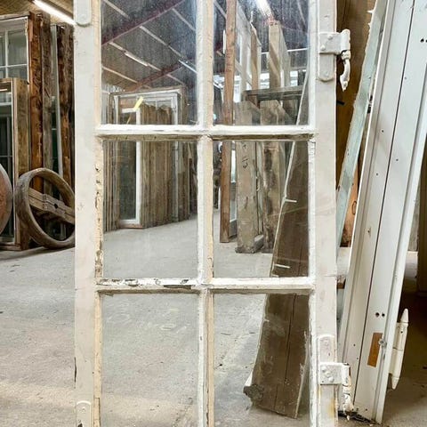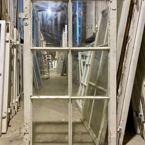 Klassisk, fin og stor 6-ruders vinduesramme med smalle sprosser og kittede ruder. Med sundt træværk. Behov for vedligeholdelse i form af maling og reparation af kit. Gode, faste hjørnebånd.