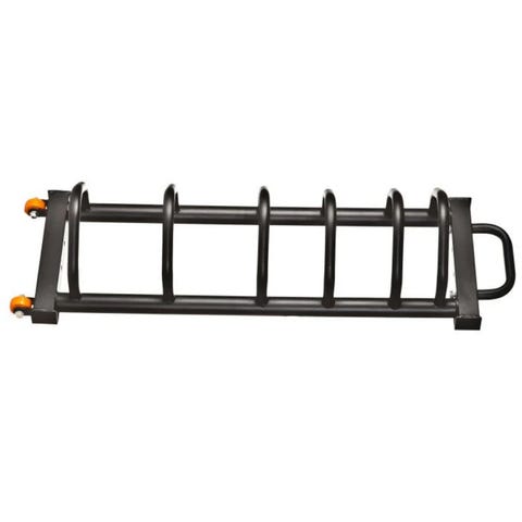 Gulvstativ - Rack til vægtskiver med hjul Farve: Matsort Længde: 140cm Bredde:35cm Højde: 32cm Plads til 8 - 10stk skiver afhængig af størrelse. Dette kraftige rack til bumper plates er giver stor fleksibilitet i indretningen af fitnesscenteret