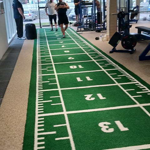 Turf Prowler bane 2 x 10m Orange Denne prowler bane er for den er den ultimative kvalitet som kan benyttes år efter år uden hverken, slid, misfarvninger eller løse tråde. Længde: 10,6 meter Bredde: 2 meter Tykkelse: 22mm Farve: Orange / Brick Mønster: 1 - 10 meter tal og bokse i hvid gennemsyet tråd (Ikke bare farve som kan slides af) Leveres i 4 farver: Grøn, Blå, Sort & Orange Leveres i 2 tykkelser: 16 eller 22mm. (Pakker perfekt til at ligge ned i et 15 eller 20mm tykt gummigulv, så man slipper for kanter eller overgange. Kan leveres med eget logo mod merpris. (Ring og tal med os om dette) Fandt du ikke den model eller størrelse du manglede, kan du se de andre modeller HER , eller give os et kald, så finder vi den rigtige løsning. Meget tæt i maskerne: PAVIGYM TURF er lavet i den absolut bedste kvalitet på markedet med 83.000 sting pr. m2. Denne tæthed sikrer et uovertruffent greb med fremragende komfort og slidstyrke, når du udfører gulvøvelser med høj modstand. Med en maksimal tykkelse og vægt på 22 mm og 6.500 g pr. m2 tilbyder TURF en perfekt balance mellem enestående slagfasthed og nem vedligeholdelse og installation. I modsætning til andre produkter går dette kunstgræs ikke på kompromis med kvalitet eller tilpasningsevne. Designet og fremstillet ved hjælp af den nyeste teknologi for at opnå det bedste niveau af modstand til øvelser, der involverer træk, intens friktion og tunge vægte. Pavigym Turf kombinerer den bedste termiske og kemiske modstand, samtidig med at den bevarer en enestående slagfasthed. Græs til enten indendørs eller udendørs træning! Vi kan designe alle typer "Lege Pladser" til dit fitnesscenter. Hvorfor vælge denne Pavigym Prowler bane? STOR TÆTHED Med 83.000 masker/kvm. Den tåler at trække slæder, håndvægte osv. Kombineret med dets lave "hår" gør det den til den ideelle løsning til funktionel træning og crosstræning i dit fitnesscenter UV-resistent. Forstærket modstand mod UV-stråler gør TURF til det ideelle kunstgræs til brug i områder udsat for direkte sollys, du kan nyde levende farver uden at skulle bekymre dig om falmning eller misfarvning. KOMFORT. Skumbundlag sikrer en så stor bevægelsesabsorption og fasthæftelse samt en ekstrem blød og komfortabel følelse, som normalt kan sammenlignes med gulve designet til børn. SE OG FØL. Fås i forskellige farver, du kan endda vælge at tilføje markeringer eller dit logo. UDENDØRS TRÆNING. Denne prowler bane bruges oftest indendørs, men den er designet så den også kan benyttes til hård udendørs brug. Skab det bedste udendørsrum til crosstræning eller funktionel træning med dit skræddersyede græstæppe. Pavigym er den en af de største producenter i Europa, som vi er stolte af at være distributør for. Læs mere her