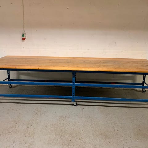 Ældre dansk kontorbord leveret af Purup Kontor Montering A/S omkring 1965. Bordpladen er monteret på de 2 skuffesøjler, og der er en udtræksplade på modsatte side af skuffefronterne. Bordet er 210 x 100 cm og 73 cm højt. Det er med patina og brugsspor. Der er 4 skuffer i venstre side og 5 skuffer i højre side. Bordet er fra Aarhus Kommunehospital.