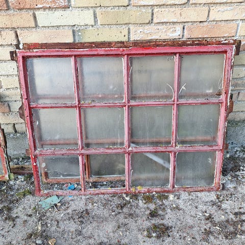 Gammelt støbejerns vindue med enkelt lags glas. Kan variere lidt i udsende, og der kan være defekt eller manglende glas.