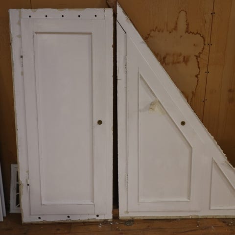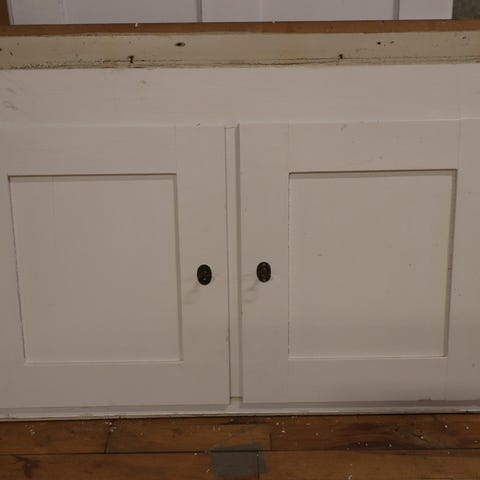 Skabs front med 2 høje låger, fra Solhuset ved Remstrup å i Silkeborg. Fronten er hånd bygget. Lågerne har messing låseplade og originale nøgler. Frontstykket er flækket i venstre side både i top og bund, så lågen sidder løs.