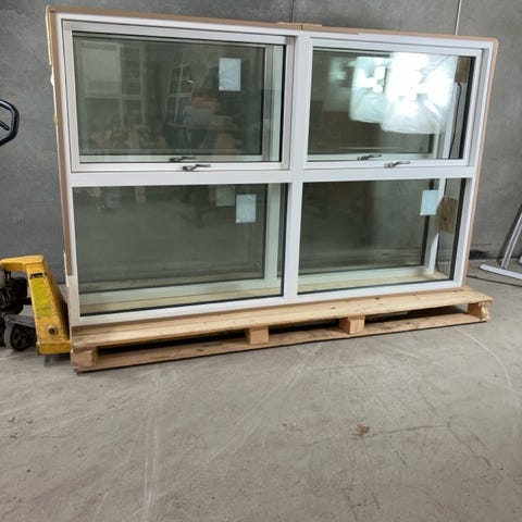 Fire fløjet karnap vindue med sprosser. Fast karms vindue i teak træ med 1 lags "frosted" glas. Et element kan åbnes i toppen. Enkelte af glaslisterne har løsnet sig og skal udskiftes. Vinduet har hængsler og spor efter hængsler til forsatsruder på indvendig side. Forsatsruder til det lille felt øverst i vinduet medfølger. Midtersektion er 161Bx209Hcm side stykkerne er 82Bx209Hcm. samlestykke i teak til begge sider medfølger. Mål: B2840xH2090xD110mm