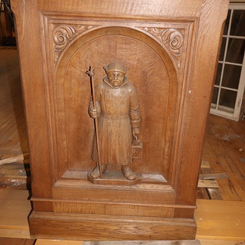 Taler pult i mørk bejdset Egetræ. Pulten mangler udsmykning på hver side, samt midterstykke, og har en revne i venstre side. Mål:B940xD520xH1190mm
