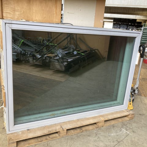 Vindue træ-alu grå 1375x1335mm. Vinduet er topstyret, og med 2-lags tonet glas fra 2008. Gummilisten langs glasset er skadet af sol. Ridser og skrammer kan forekomme, og der vil være byggestøv/skidt på vinduerne. Karmmål 137,5x133,5x12cm.