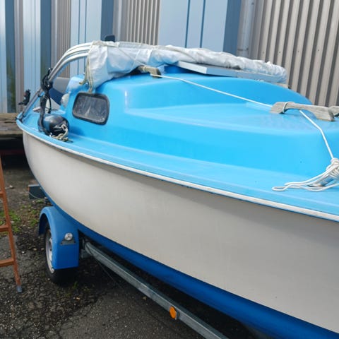 Medfølger benzintank 25L, årer med åregafler, anker og havnekaleche.