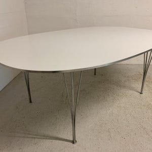 Elipsebord med 2 plader af santos palisander, monteret med spændben af forkromet stål.