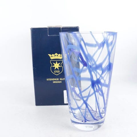 Aflang glas vase fra Stenninge Slot 24 cm høj og 17.5 bred. Flot farvespil i orange og gul m/ 2 flyvende gæs. Hel og fin uden afslag.