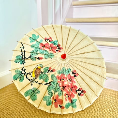 Super fin lille vintage paraply. Bryllupsparaply til børn eller en lille paraply eller parasol til dukkerne. Super fin med hvidt broderet stof. Rigtig flot stand!