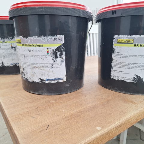 En halv spand bygningsasfalt til tjæring af beton under jorden gives væk.