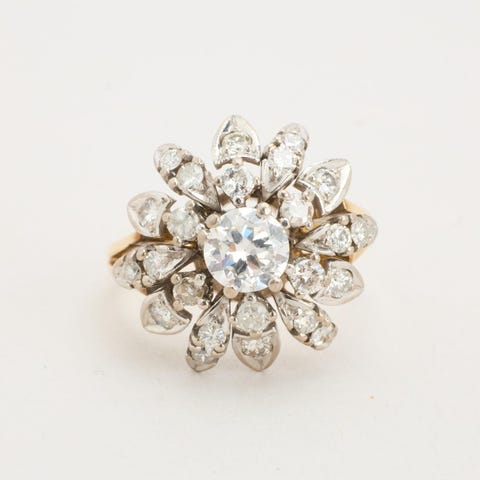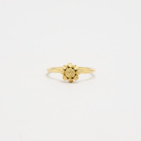 Blomsterring i 14K guld med hvide og grønne sten, Str.