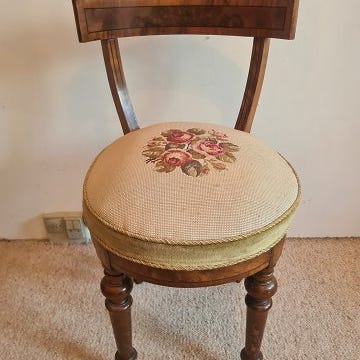 Pianostol fra 1930'erne I mahogni og fyr med broderet sæde. Fremstår pæn og velholdt uden nævneværdige brugsspor.