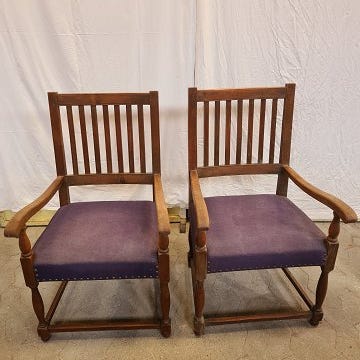 Sorø Stolefabrik par armstole i egetræ med armlæn i massiv teak samt betrukket med stof på sæde og ryg. Produceret ca. 1970'erne.