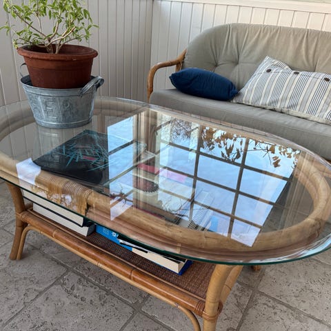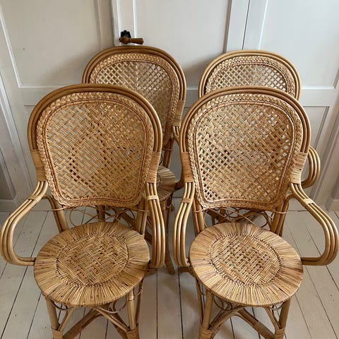 3 Stole, en fodskammel og lille bord i bambus, af nyere dato.