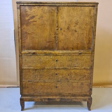 Funkis inspireret dækketøjsskab fra 1940'erne I birk og med glas skydelåger. Fremstår pænt, velholdt og udmærket funktionsdygtigt. Dog mangler en nøglehulskrans på skabsågen. (Billede)