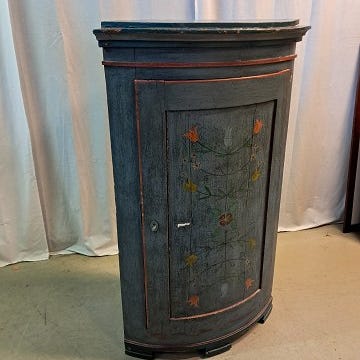 Hjørneskab fra 1940'erne i fyr og med glaslåge. Fremstår pænt og velholdt uden nævneværdige brugsspor.
