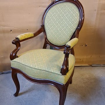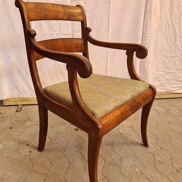 Armstol fra 1910´erne i mahogni. Fremstår pæn og udmærket stabil. Dog lettere tyndslidt på sædet med et løst kantbånd. (billede)