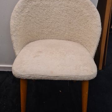 Sminkebordsstol polstret med lammeuld samt stel i teak. Udført hos Snedkermester Frode Holm ca. 1950'erne. Brugt stand, trænger til ombetrækning.