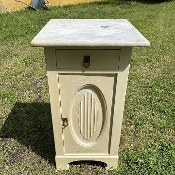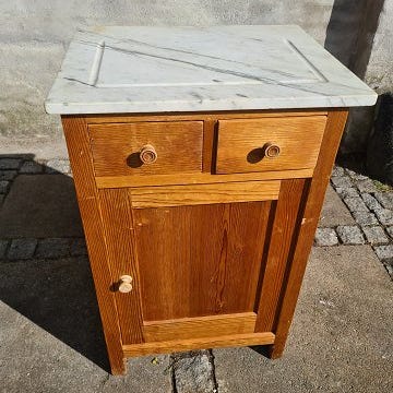 Savante i mahogni med marmorplade fremstår med brugsspor.