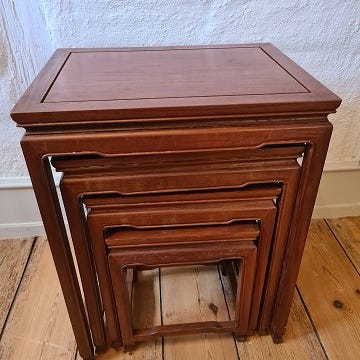 Indskudsborde i orientalsk stil med rigt udskårede bordplader og overliggende glasplader. Fremstår pæne og velholdte uden nævneværdige brugsspor.