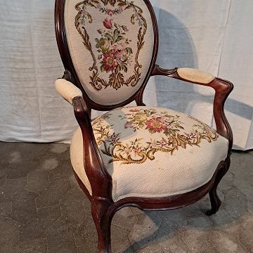 Armstol i mahogni med broderet betræk fra 1900erne.