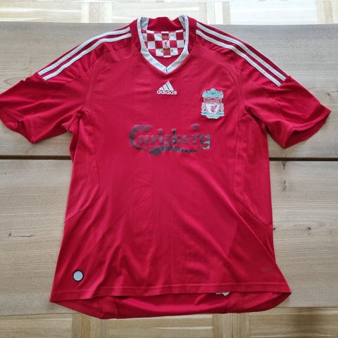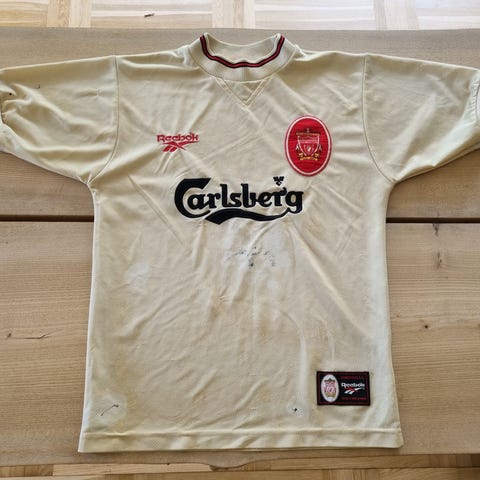 Liverpool-trøje fra 1999 med kultspilleren #4 Rigobert Song bagpå. Størrelsen er "YTHS" hvilket målmæssigt svarer til en XS eller måske en lille S. Den måler 67x47.