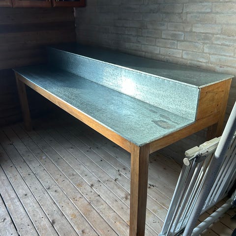- Med en arbejdsbordplade i zink og en opbevaringshylde