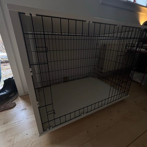Dette møbel fungerer både som et hundebur og et endebord. Det er et praktisk og flot supplement til din stue.