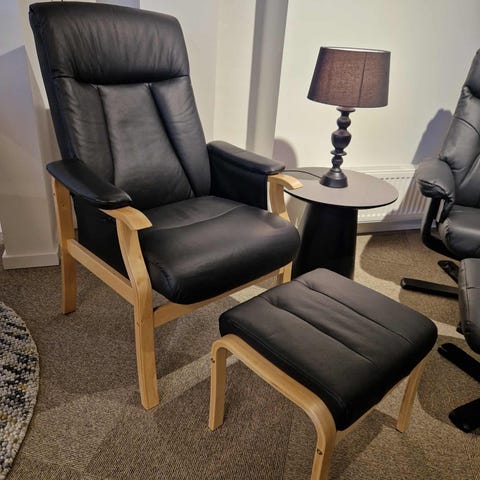 Denne tv-stol i kunstlæder med en fodskammel kombinerer stil og funktionalitet. Sættet har et stærkt træ- og metalstel, fyldt med skum med høj tæthed og betrukket med kunstlæder af høj kvalitet for maksimal komfort. Det tykke sæde og det bløde ryglæn er yderst behagelige. Desuden kan ryglænet lægges tilbage, og du kan lægge fødderne op på vores komfortable fodskammel. Stil denne lænestol af kunstlæder i ethvert rum for at skabe et hyggeligt hvilested, hvor du kan læse, se tv eller bare slappe af. Du vil elske den! Materiale, stel: Træ + malet jernFarve: SortRyglænets vinkel kan justeresMål, maks. tilbagelænet: 66,5 x 110 x 85 cm (B x D x H)Mål, min. tilbagelænet: 66,5 x 75 x 99 cm (B x D x H)Mål, sæde: 49,5 x 50 cm (B x D)Sædehøjde fra gulvet: 45,5 cmHøjde, ryglæn: 66 cmDiameter, fod: 57 cmMål, fodskammel: 44,4 x 40 x 41 cm (B x D x H)Diameter, fodskammel: 40 cmNem at samleMaks. bæreevne: 110 kgStof: Bomuld: 10%, Polyester: 30%, Polyurethan: 60% Maks. 110 kg per sæde. Vær opmærksom på risikoen ved åben ild og andre varmekilder i nærheden af produktet.