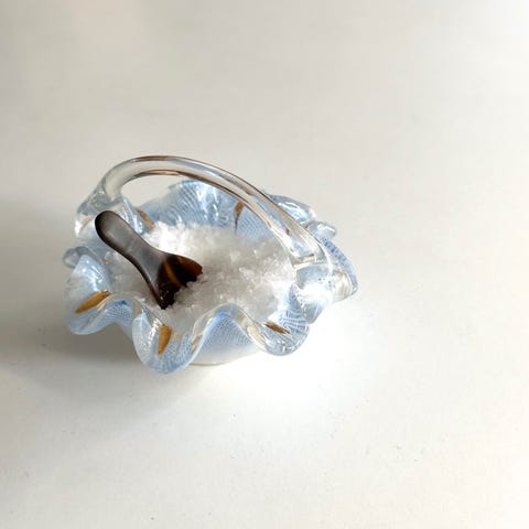 Smuk, gammel glasskål med ciseleringer og messingholder med hank i flet. Brug den i køkkenet, på badeværelset, til lys mv.