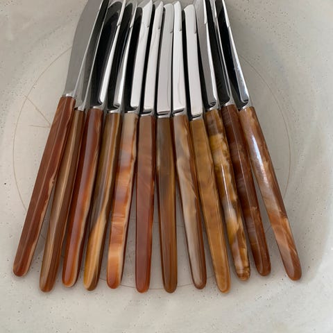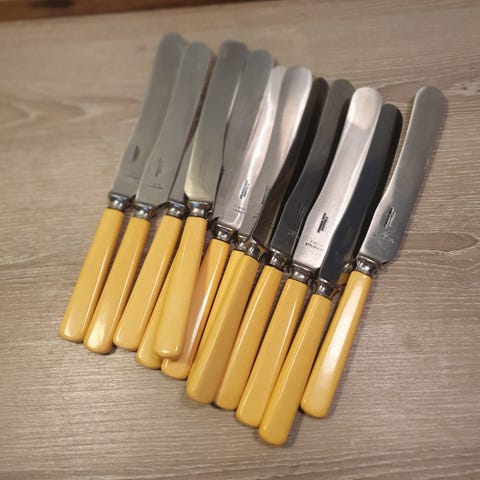 Æske med 6 engelske middagsknive med cremefarvet plastskaft21 cm lange