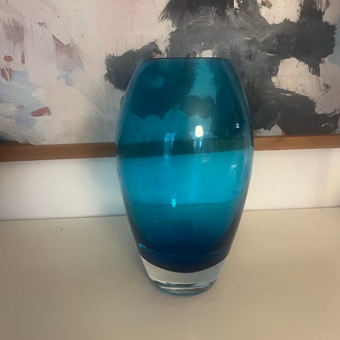 Smuk, antik glasvase som er håndmalet indvendigt med den fineste blomst og støvede toner.Malingen er en kende skrøbelig efter alle disse år, så den skal vaskes forsigtigt.21 cm høj