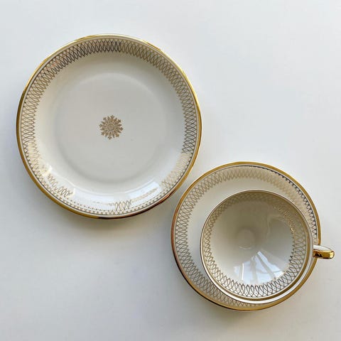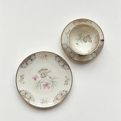Triosæt, stor kop m underkop og kagetallerken, gylden med blomst, pr sæt