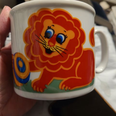 Børnekop af fajance, med yndige motiver.