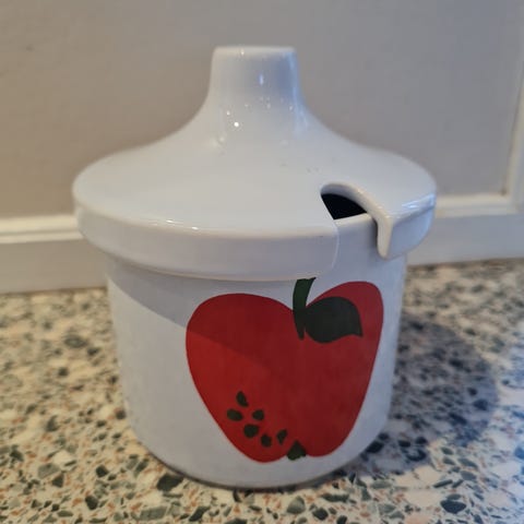 Gammel, svensk køkkenkrukke af fajance, med gyldne detaljer og teksten “Socker”. Brug den til granola, badesalt, sukker, karameller…