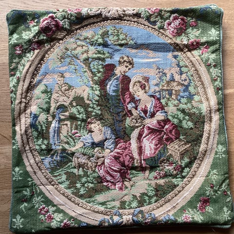 Gul retro pudebetræk af groft tekstil med 3 kvaster - der mangler en i det øverste hjørne.