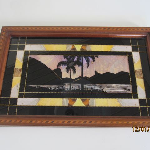 Antik træbakke m bemalet glasplade