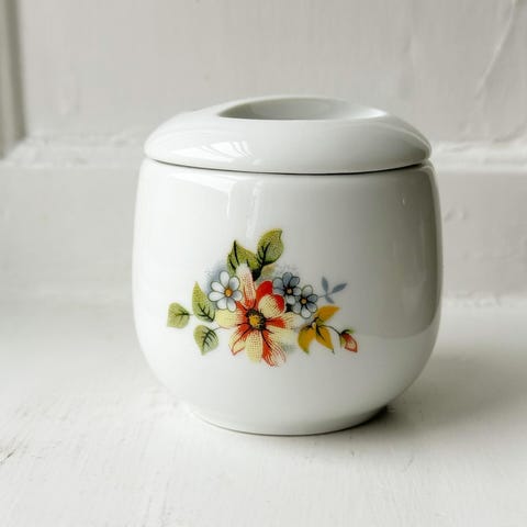 Tysk lågkrukke af porcelæn med blomstertryk