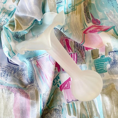 Fantastisk, aflang vase af mundblæst, hvidmeleret glas