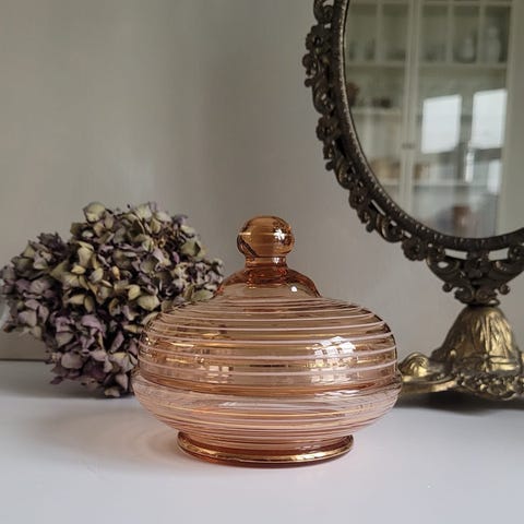 Bæger af glas, nærmest rabarberrød tone, med to klare dutter