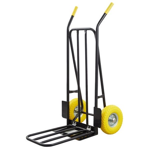 Sort sækkevogn med udfaldsrampe og gule håndtag. En det vi kalder no-nonsens sækkevogn til helt almindelig brug i haven, ved flytning mm. Med udfaldsrampe (28x40 cm) Hjul med luft Max belastning: 150 kg Nr. 8005062