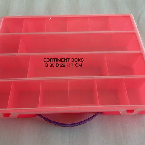 Organizer / sortimentskasse med 18 rum og gennemsigtigt låg. Vha. rumdelere kan udvide størrelsen af de enkelte rum efter behov. I kraftig plastik med gennemtænkt lukkesystem. Bemærk også at der er riller i låget, så det slutter helt tæt omkring rummene. 18 rum á 69 x 77 x 55 mm Udvendig str: 420 x 305 x 61 mm Nr. 76744