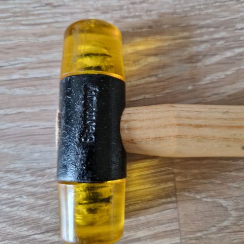 Gummihammer eller pløkhammer om man vil. Med træskaft og gummihoved. Vægt: 550 gram Længde på skaft: 36 cm Diameter hoved: 65 mm Bredde hoved: 105 mm Nr. 002616