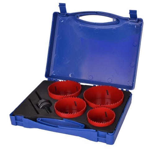 Professionelt hulsavssæt i Wolfram-Carbid med 5 forskellige kopbor. Kan bruges til murværk, fliser, klinker, gasbeton, tagsten, gips og lignende. Leveres med viste holder og styrebor Størrelser: 1-5/16" (ø33 mm)2-3/32" (ø53 mm)2-5/8" (ø67 mm)2-7/8" (ø73 mm)3-1/4" (ø83 mm) Nr. 8007462