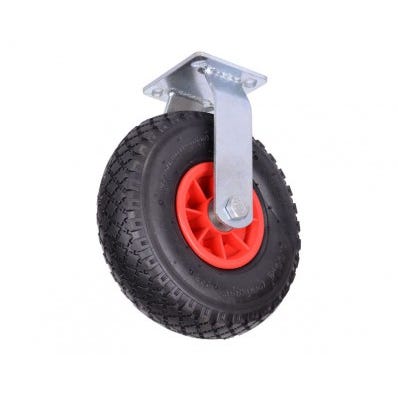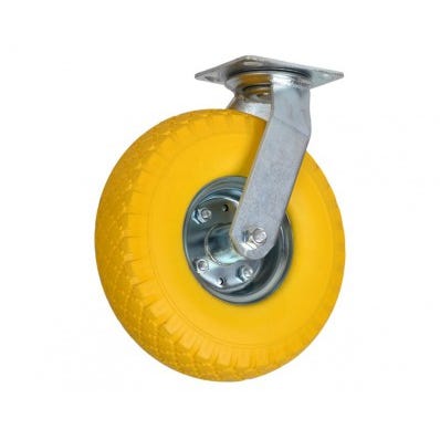 10" transporthjul med fast fod og punkterfri hjul. Dækket er fyldt med PU skum. De punkterfrie hjul er smarte, hvis man ønsker at undgå punkteringer. Vær opmærksom på at punkterfrie hjul nemt får en “flad” side, hvis de står stille med belastning i lang tid ad gangen. Der er også derfor at disse transporthjul har en max belastning på "kun" 75 kg pr. hjul. Dæktype: 3.00-4 (260x85) Max belastning: 75 kg Kraftigt 10" hjul med fast fod Beslag str: 100 x 115 mm Totalhøjde: 300 mm Nr. 8006780