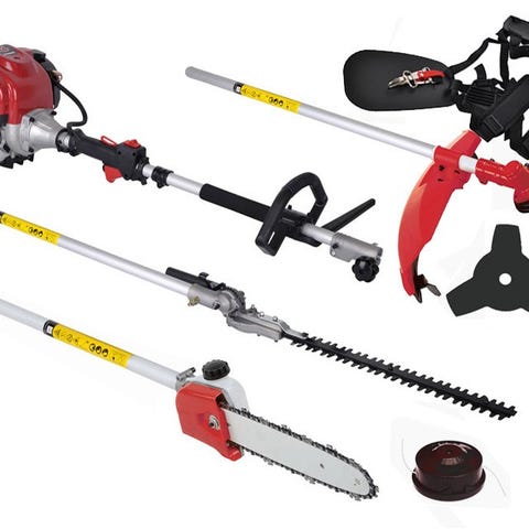 Multiskærer / stangklipper med 4 værktøjer, og H-sele. Dette sæt er forsynet med en driftssikker 2-taktsmotor med masser af kræfter. Græstrimmer, kædesav og hækkeklipper er monteret på skaft, så de er nemme og hurtige at skifte uden brug af værktøj. Hertil kommer løs klinge til buskrydder. Totallængde med hækkeklipper monteret er omkring 210 cm. Specifikationer: 52 cc 2-taktsmotor 600 ml tank Egenvægt afhængig af værktøj: 7 - 8 kg Lidt om de forskellige værktøjer, der følger med denne multiskærer: Stangklipper: 400 mm - afstand mellem tænder: 25 mm - kan vinkles 180° - se også billede Kædesav: 12” - ekstra kæde kan tilkøbes Græstrimmer med trimmerhus - 10 mm linksgevind - passer til næsten alle snørehuse. Klinge til buskrydder + beslag til montering H-sele - med 2 skulderremme Nr. 8006829 Skal du endnu længere op kan du med fordel tilkøbe vores 100 cm forlænger. Eller du kan tilkøbe fræser eller fejekost - se herunder for mulighederne. Dette sæt findes også med 4-taktsmotor - se herunder for andre sæt.