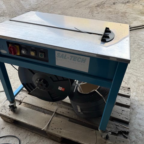 Pakkemaskine/Båndmaskine Sætter stapex-bånd rundt om alle former for pakker. Strammer båndet tæt om pakken, og kan bruges til stort set alt manuelt pakkearbejde af større og mindre pakker. Størrelse på pakke"bord" 50x80 cm Regulering af tilstramning: 40-480 N Hastighed: 1,8 meter/sek. Mulighed for manuel trådfremføring Varmer op på ca. 1 minut Med hjul så den er let at flytte rundt på Egenvægt: 85 kg Til spørgsmålet om, hvorvidt man kan købe bånd til denne maskine - og blive ved med det fremover - er svaret: ja. Vi har nemlig en nøjagtig magen til her og vi vil også gerne kunne blive ved med at bruge den. Nr. KZB-1