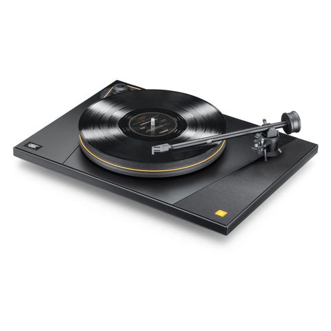 Hi-fi-møbel med plads til vinylplader. Udskæringen matcher et pladecover i bredden, så du kan udstille samlingen. 45 cm dyb, fås i sort eller hvid.